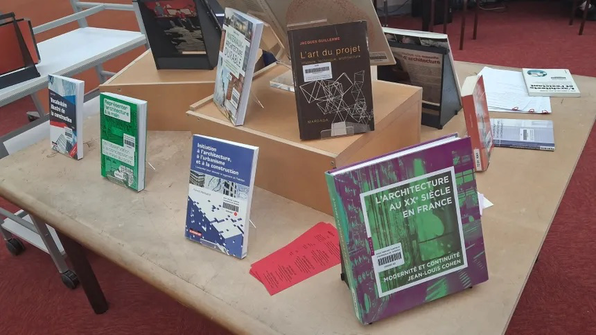 Le texte que nous avons mis est : "Cette image est une table, sous forme de présentoir, sur laquelle sont présentés neuf livres principaux dédiés à l'architecture. On aurait pu détailler bien plus ces couvertures pour créer plus de textes dans cette image sans que celle-ci en soit illisible."